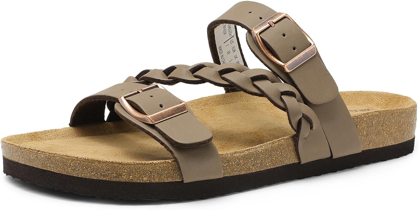 DREAM PAIRS Women’s Slides Soft Cork Footbed Sandals Comfortable Walking Slip-on Flat Sandals Arch Support Adjustable Buckle Braided Straps Slippers